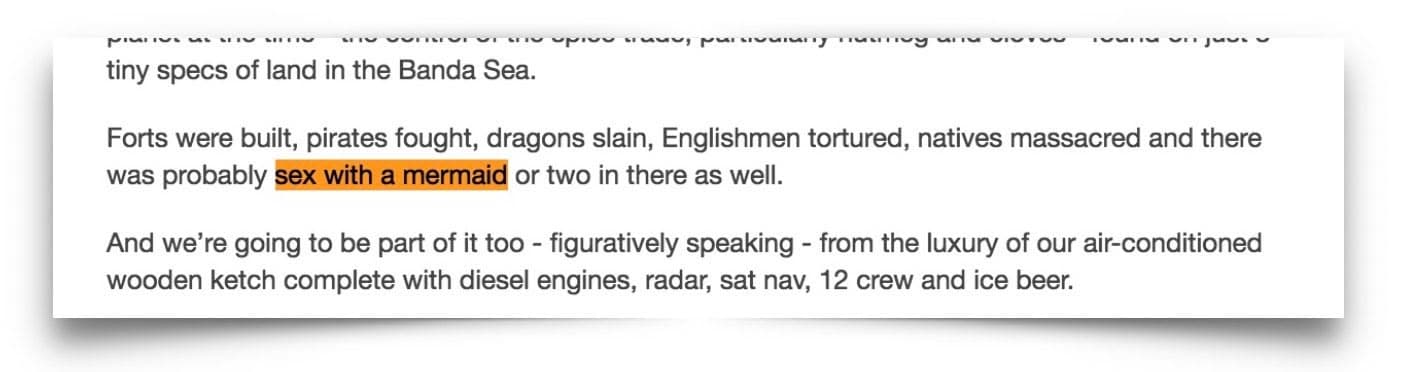 When we were first promoting our sailing adventure to the Banda Islands I wrote a marketing email that included a throwaway line about old-timey sailors possibly having sex with mermaids.
